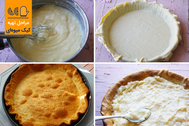 ابتدا قالب کیک را کمی چرب میکنیم و سپس خمیر پای را داخل قالب کیک پهن میکنیم. با چنگال سوراخهایی را در تمام قسمتهای خمیر ایجاد میکنیم و سپس آن را به مدت ۱۵ دقیقه در دمای ۲۰۰ درجه سانتیگراد، داخل فر قرار میدهیم. سپس آن را از فر خارج میکنیم و کنار میگذاریم.
